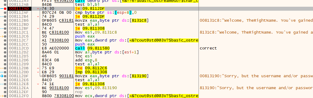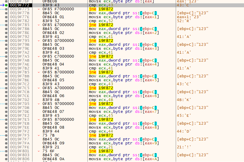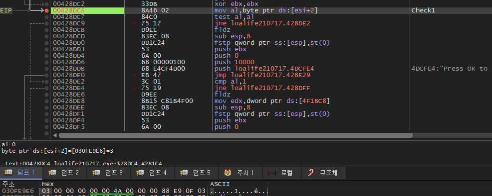 Check1: [ESI+2] 값을 통해 test 명령 뒤 분기를 하는데 1값이 아니면 에러 메세지를 뱉었다.
